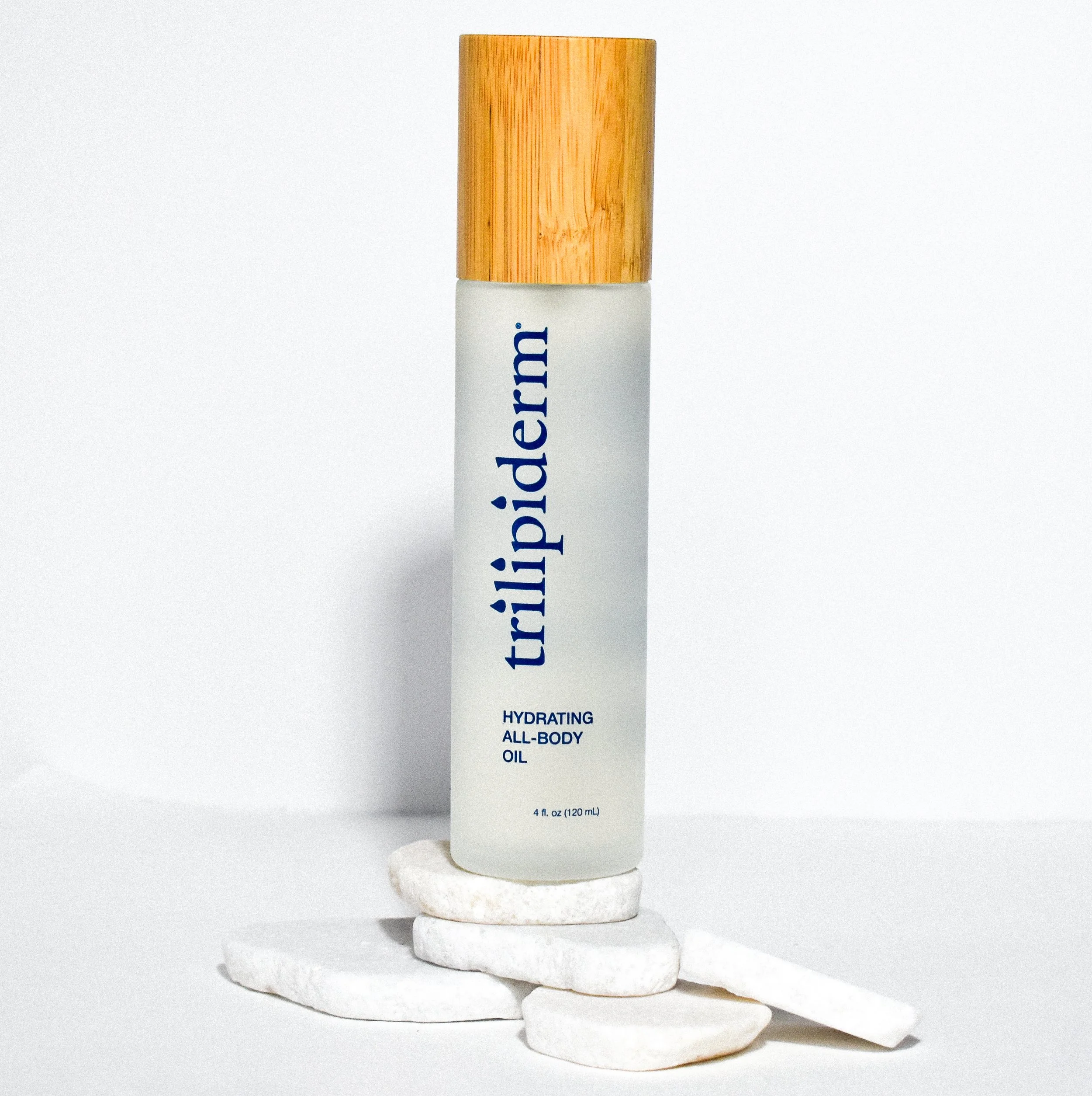 Glass/bamboo packaging for luxury brand Trilipiderm’s Hydrating All-Body Oil. The bottle was screen printed by a local vendor in Wyoming.