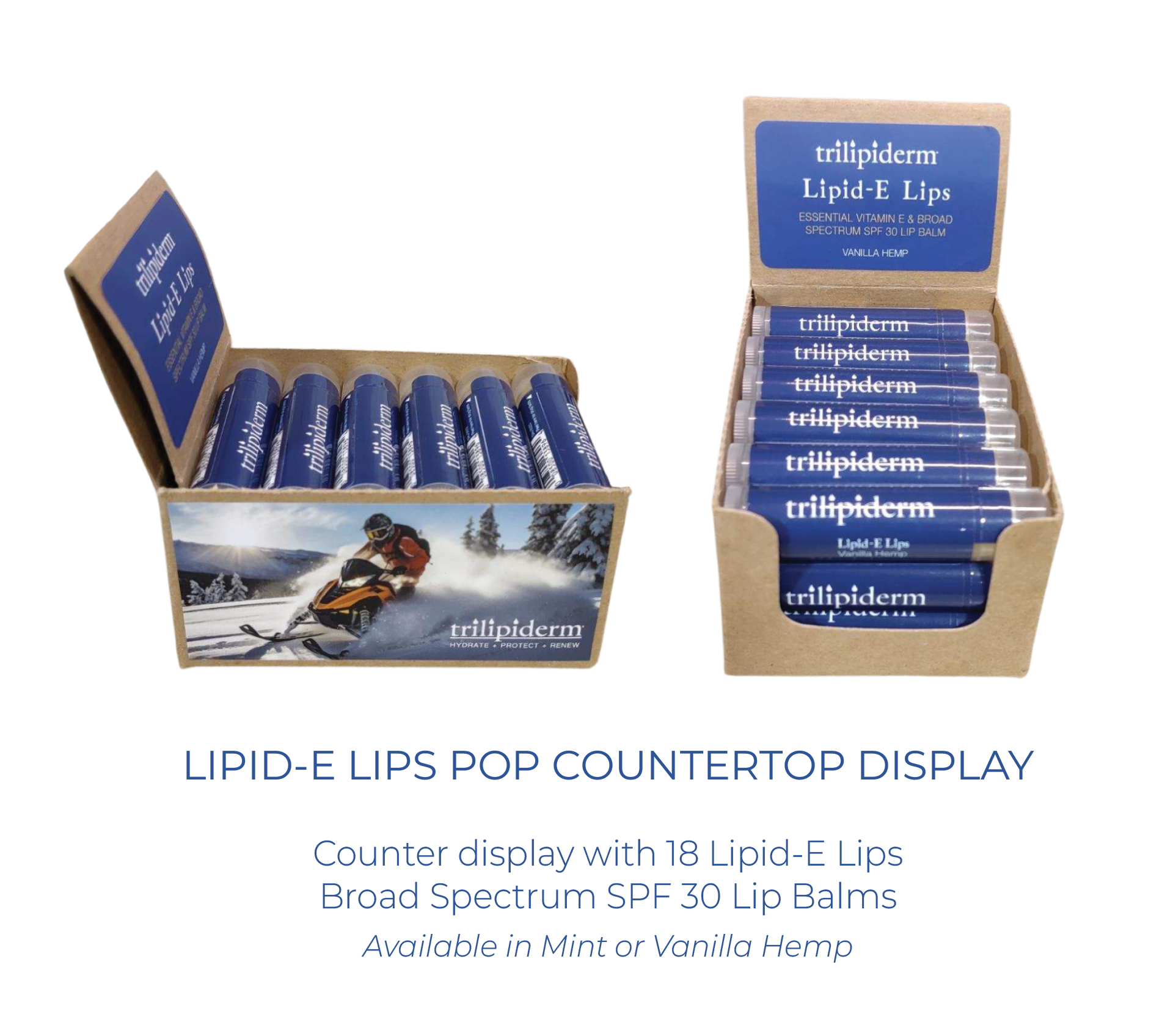 When your company makes a commitment to eco-friendly packaging and assets, designing displays can get tricky. Above is the countertop display for Trilipiderm's Lipid-E Lips SPF 30 Lip Balm. The base is a recycled paper display with three labels: one on the top, and one on each side. The labels on the sides can be customized by retailers.