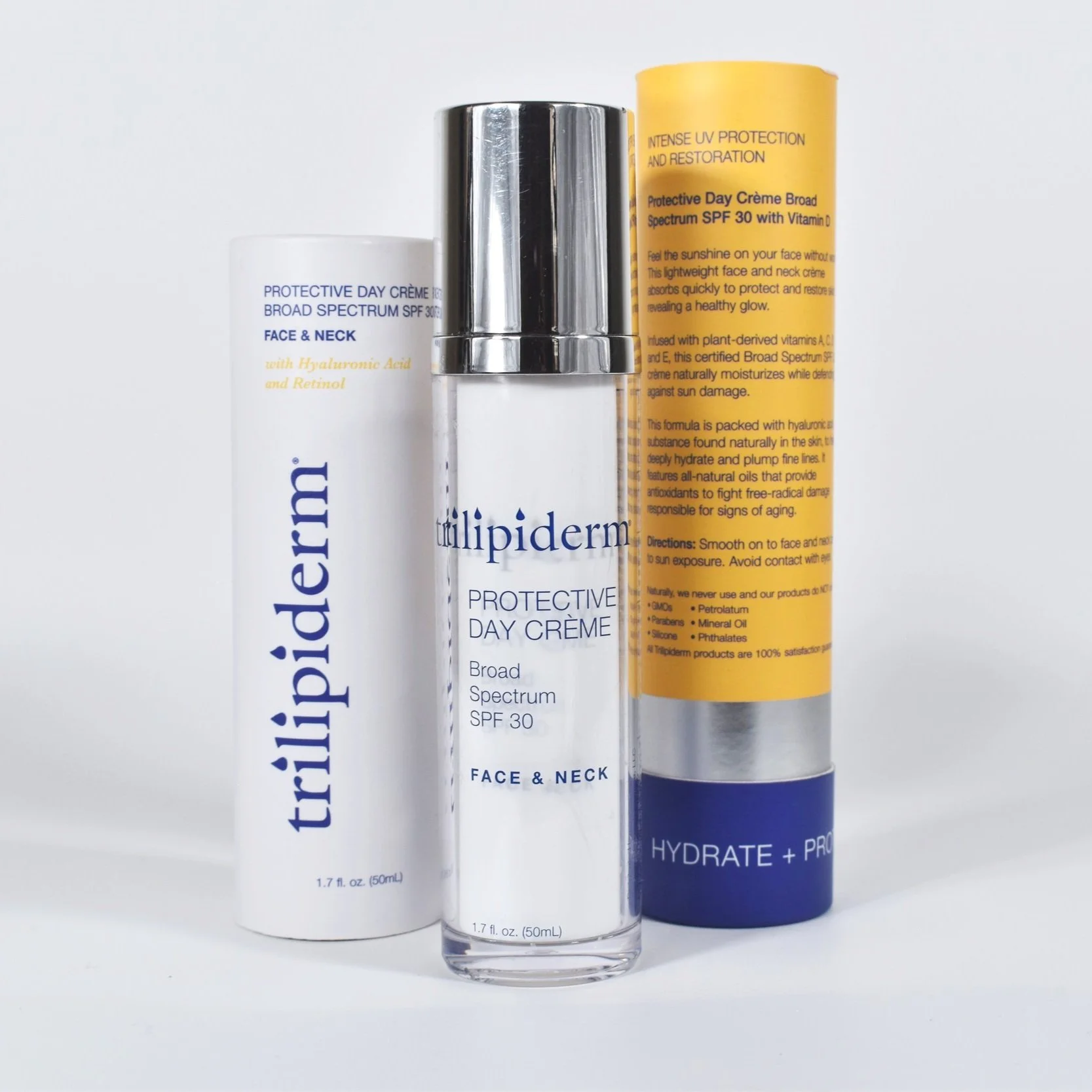 Above is Trilipiderm's Protective Day Crème Broad Spectrum SPF 30 along with its paper sleeve. This photo shows the sleeve opened, showcasing all of the information about the product.